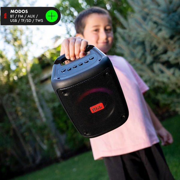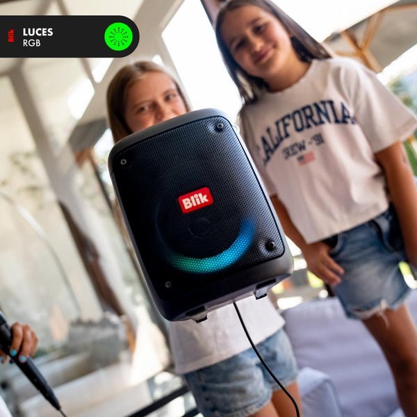 ¡Tu propio karaoke donde quieras! El Blik Voice es el parlante compacto que convierte cualquier lugar en un escenario. Con $10text{W RMS}$ de potencia real y un micrófono alámbrico incluido, estarás listo para cantar tus temas favoritos con un sonido nítido y sin distorsión. Sus vibrantes luces RGB ponen el ambiente perfecto para cada celebración.